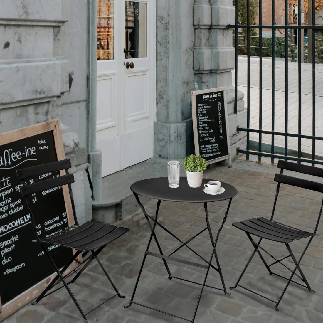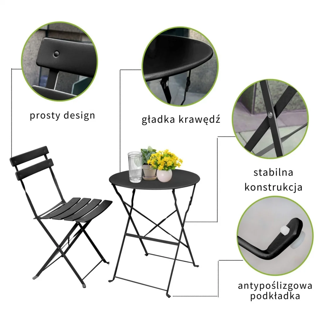 Zestaw mebli balkonowych ORION – składane krzesła i okrągły stolik, metalowa konstrukcja, komplet na taras