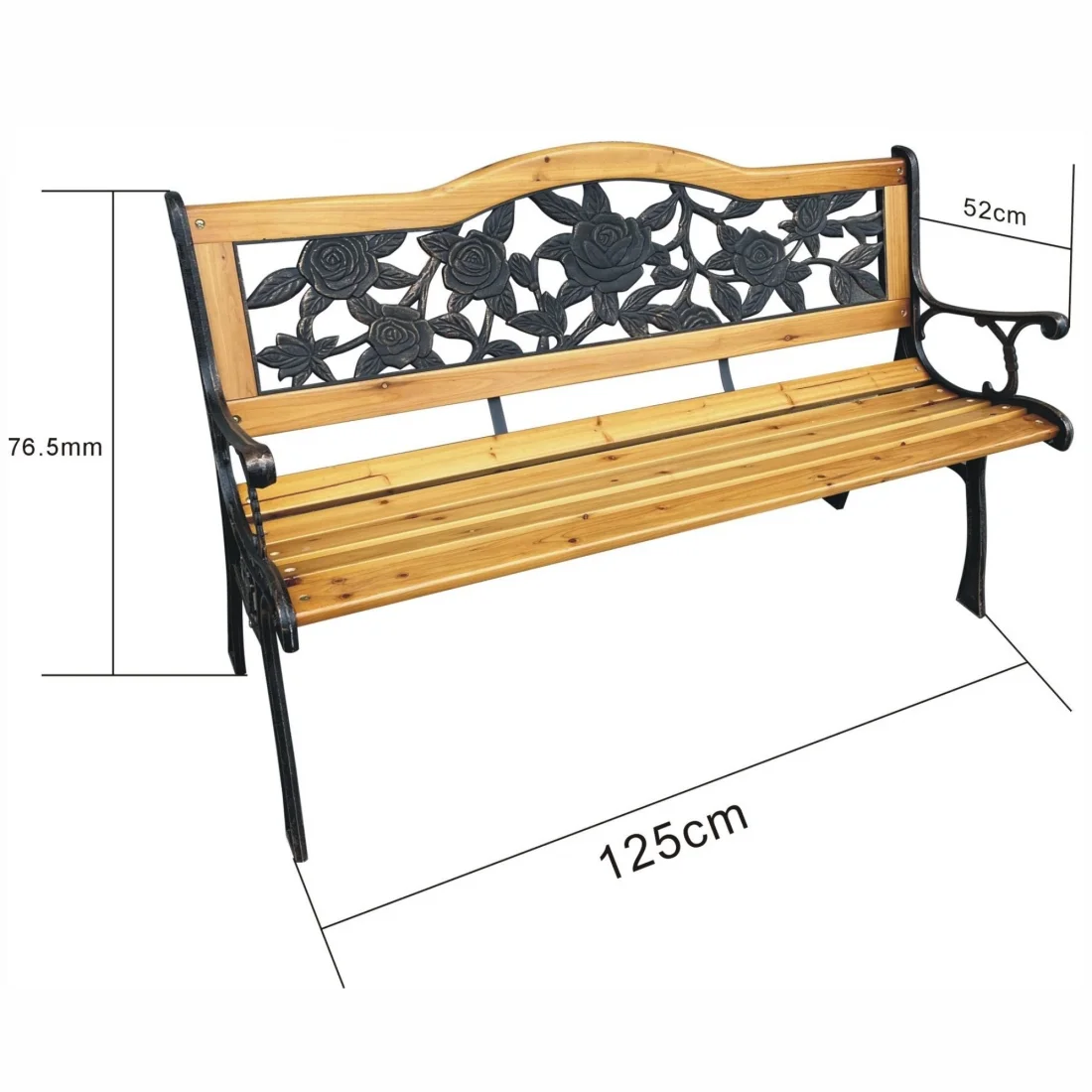 Ławka ogrodowa ROSA – drewno, żeliwo, plastik, motyw florystyczny, nośność 260 kg