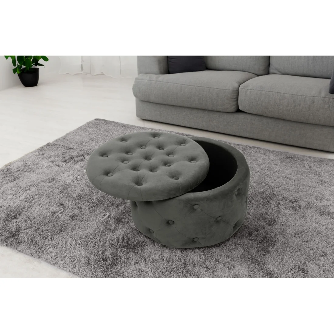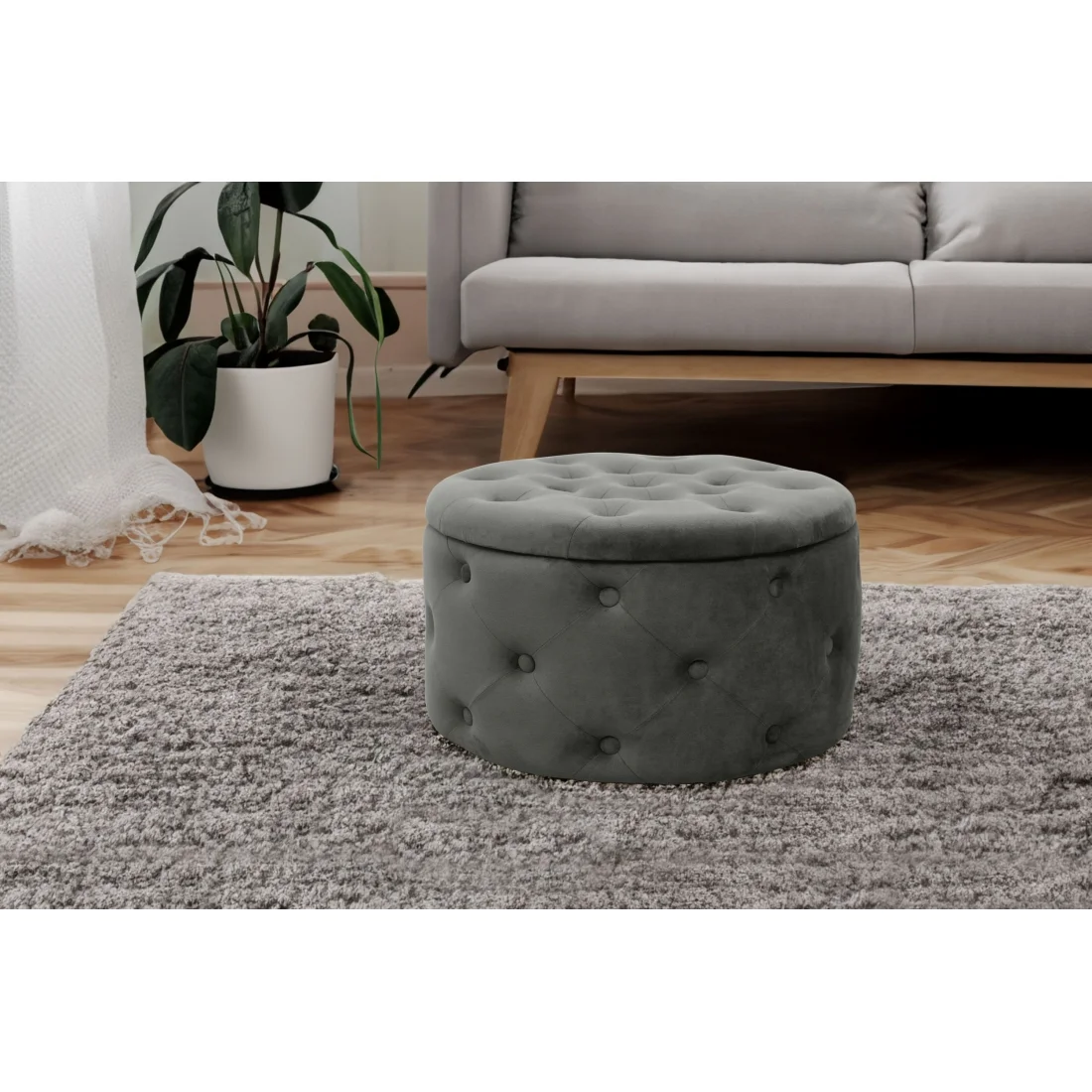 Nowoczesny wygląd pufy podkreślają dekoracyjne pikowania, które nadają meblowi elegancki charakter. Otwierane wieczko umożliwia dostęp do pojemnika, w którym można przechowywać przedmioty niepotrzebne na co dzień, pomagając utrzymać porządek w pomieszczeniu.