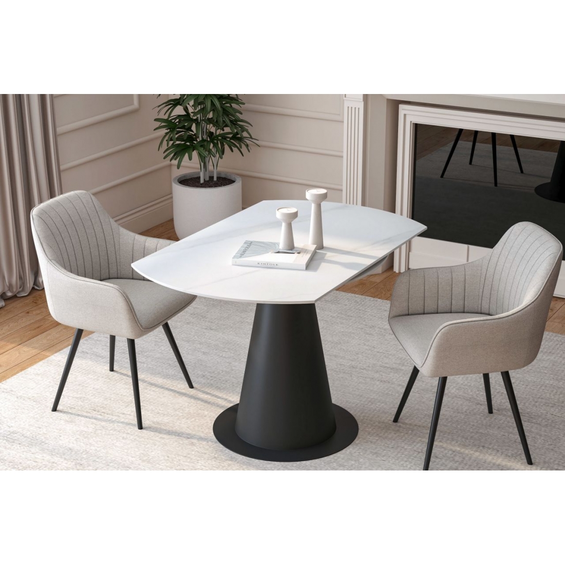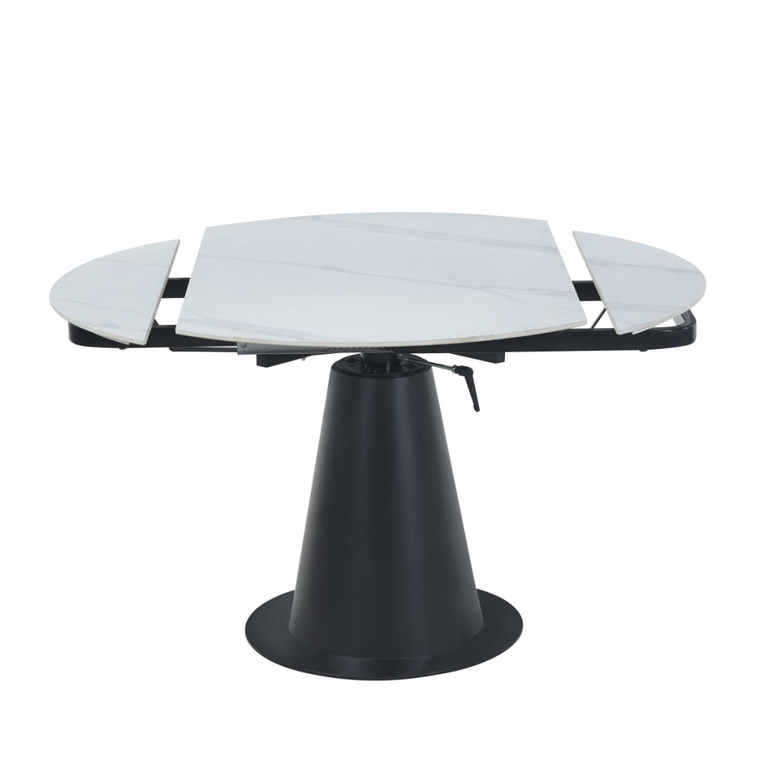 Stół prostokątny NST027 wyposażony jest w funkcję rozkładania, pozwalającą zwiększyć długość blatu z 75 do 120 cm. Blat wykonany został z ceramiki połączonej z MDF, a podstawa i rama z metalu malowanego proszkowo. Mechanizm synchroniczny obrotowy umożliwia wysuwanie dwóch zewnętrznych wkładek.