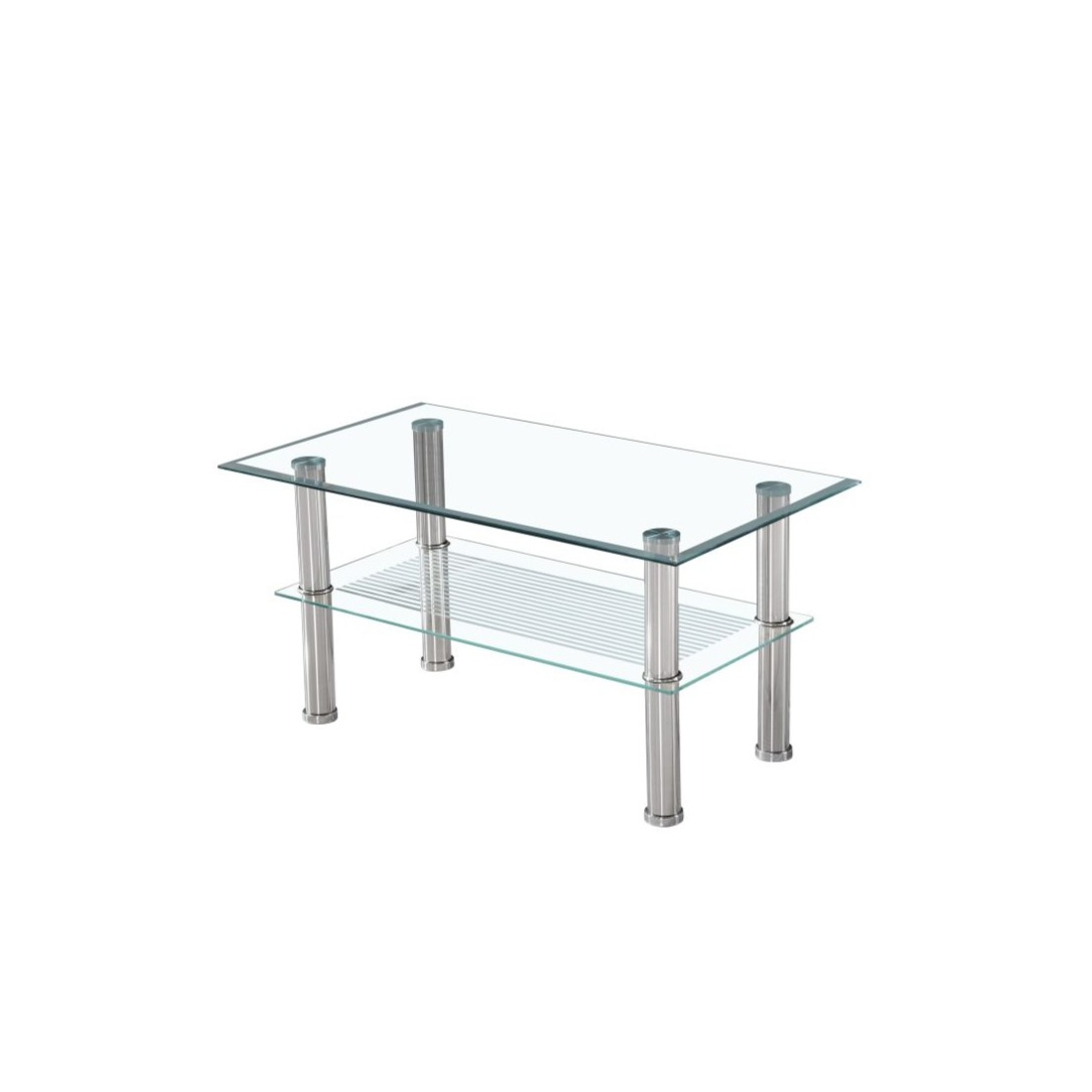 Ława szklana NSK002 wyposażona jest w blat górny wykonany ze szkła hartowanego o grubości 8 mm oraz dolną półkę ze szkła o grubości 6 mm. Konstrukcja zapewnia funkcjonalność i wygodne użytkowanie.