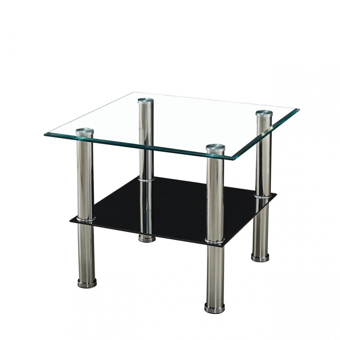 Ława szklana NSK006 wyposażona jest w dwa blaty: górny przezroczysty o grubości 8 mm oraz dolny czarny o grubości 6 mm. Konstrukcja ma kompaktowe wymiary, co ułatwia jej ustawienie w różnych aranżacjach wnętrz.