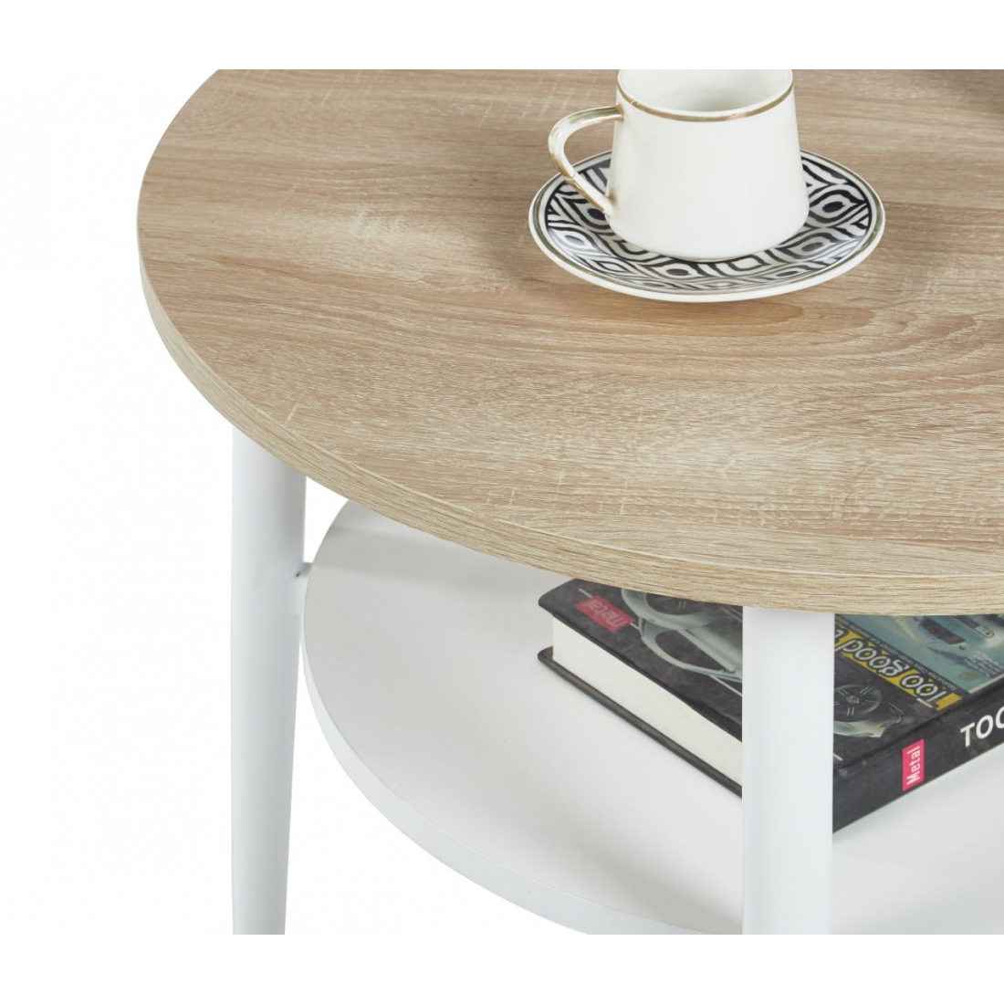 Stolik NLW010 wyposażony jest w dwa blaty wykonane z płyty wiórowej laminowanej oraz stabilną podstawę z metalu malowanego proszkowo. Jego kompaktowe wymiary sprawiają, że może pełnić funkcję praktycznego elementu w różnych aranżacjach.
