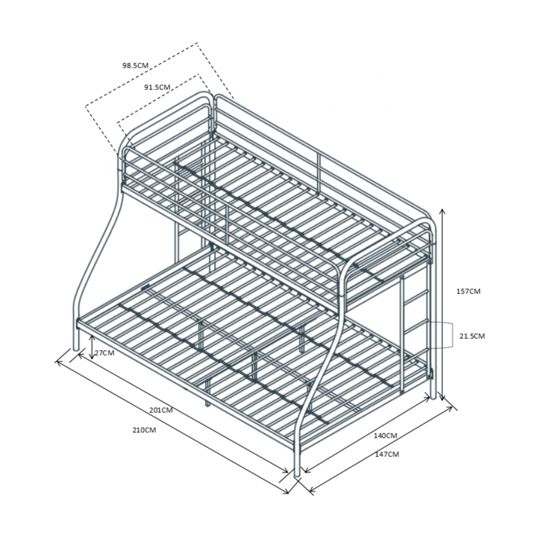 Łóżko piętrowe NLZ008 wykonane z metalu malowanego proszkowo oferuje dwie powierzchnie spania: dolną o wymiarach 140x200 cm oraz górną 90x200 cm. Konstrukcja zapewnia funkcjonalne rozwiązanie do pomieszczeń wymagających oszczędności miejsca.