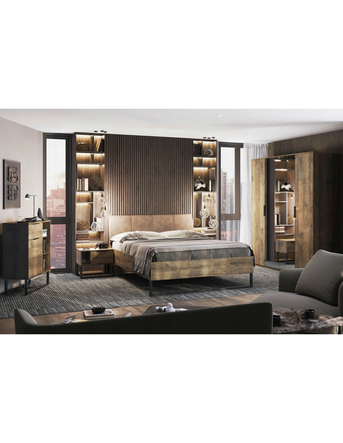 - Minimalistyczny design: Szafa w stylu loft z kontrastującymi elementami w kolorze Oak Frigate oraz czarnymi akcentami tworzy harmonijną, elegancką całość.