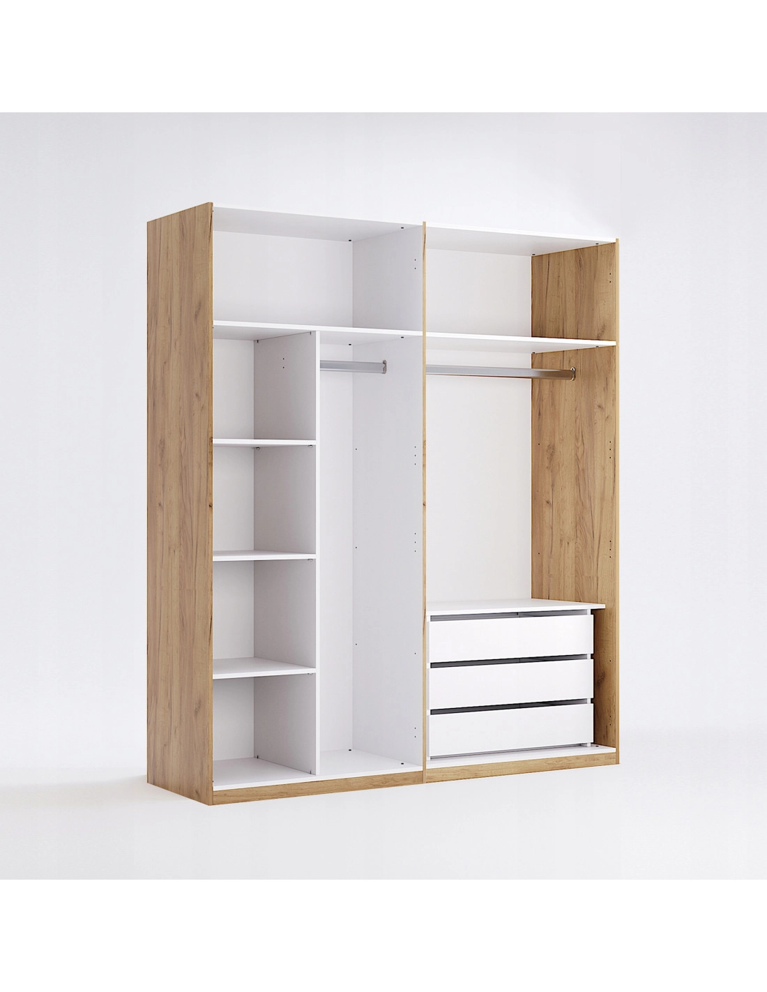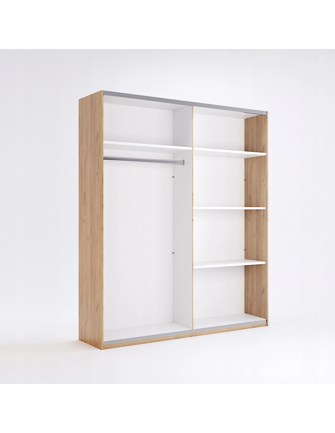 - Dodatkowe opcje wewnętrzne: Szafa umożliwia montaż dodatkowych elementów, takich jak krótkie i długie półki, półki z wieszakami, co pozwala maksymalnie wykorzystać jej pojemność.