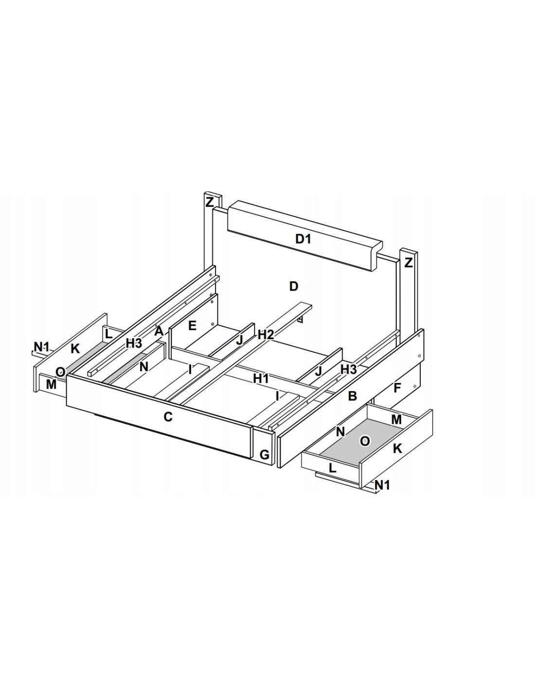 - Funkcjonalne szuflady – Łóżko wyposażone jest w przestronne szuflady, które posiadają dodatkowe wzmocnienia pośrodku, co zwiększa ich wytrzymałość oraz umożliwia przechowywanie dużej ilości rzeczy, takich jak pościel czy odzież sezonowa.