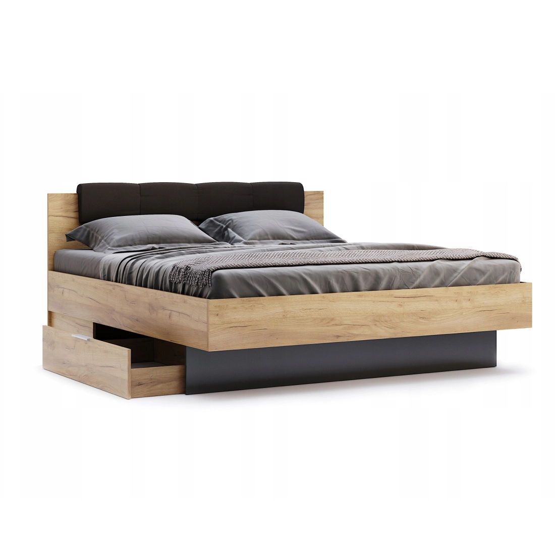 - Solidna rama z płyty wiórowej – Konstrukcja łóżka wykonana z laminowanej płyty wiórowej o grubości 16 mm - 22 mm w kolorze Dąb Craft, łącząca wytrzymałość z elegancją.
