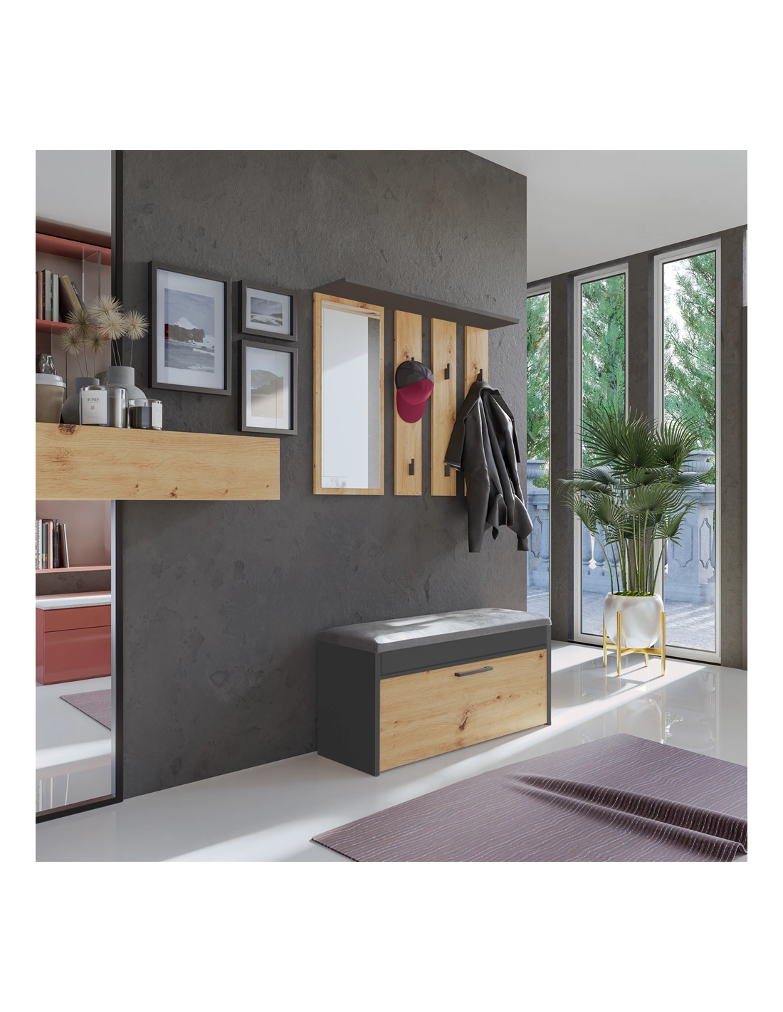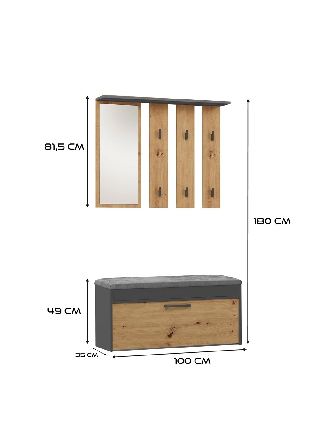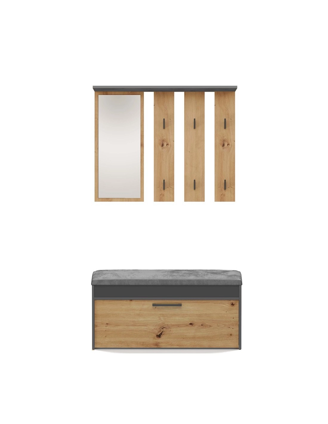 Garderoba PARMA to elegancki i funkcjonalny zestaw, który doskonale uzupełni każdy przedpokój. Połączenie nowoczesnego wieszaka z lustrem oraz praktycznej szafki na obuwie z siedziskiem i schowkiem zapewnia estetykę i wygodę codziennego użytkowania. Idealny dla osób ceniących piękny design i funkcjonalność w jednym.