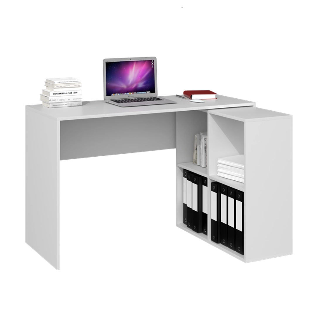 - Zintegrowany regał ułatwia przechowywanie dokumentów i akcesoriów.