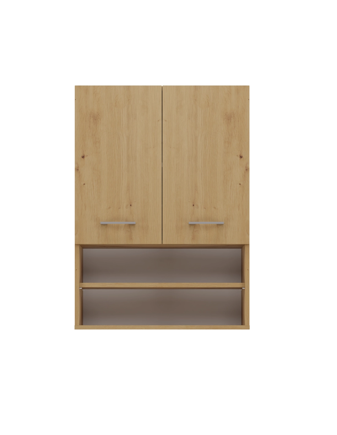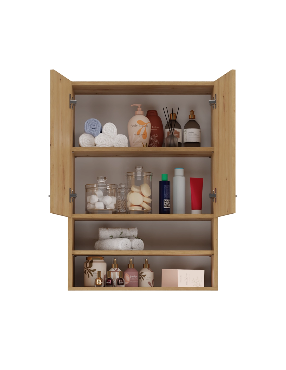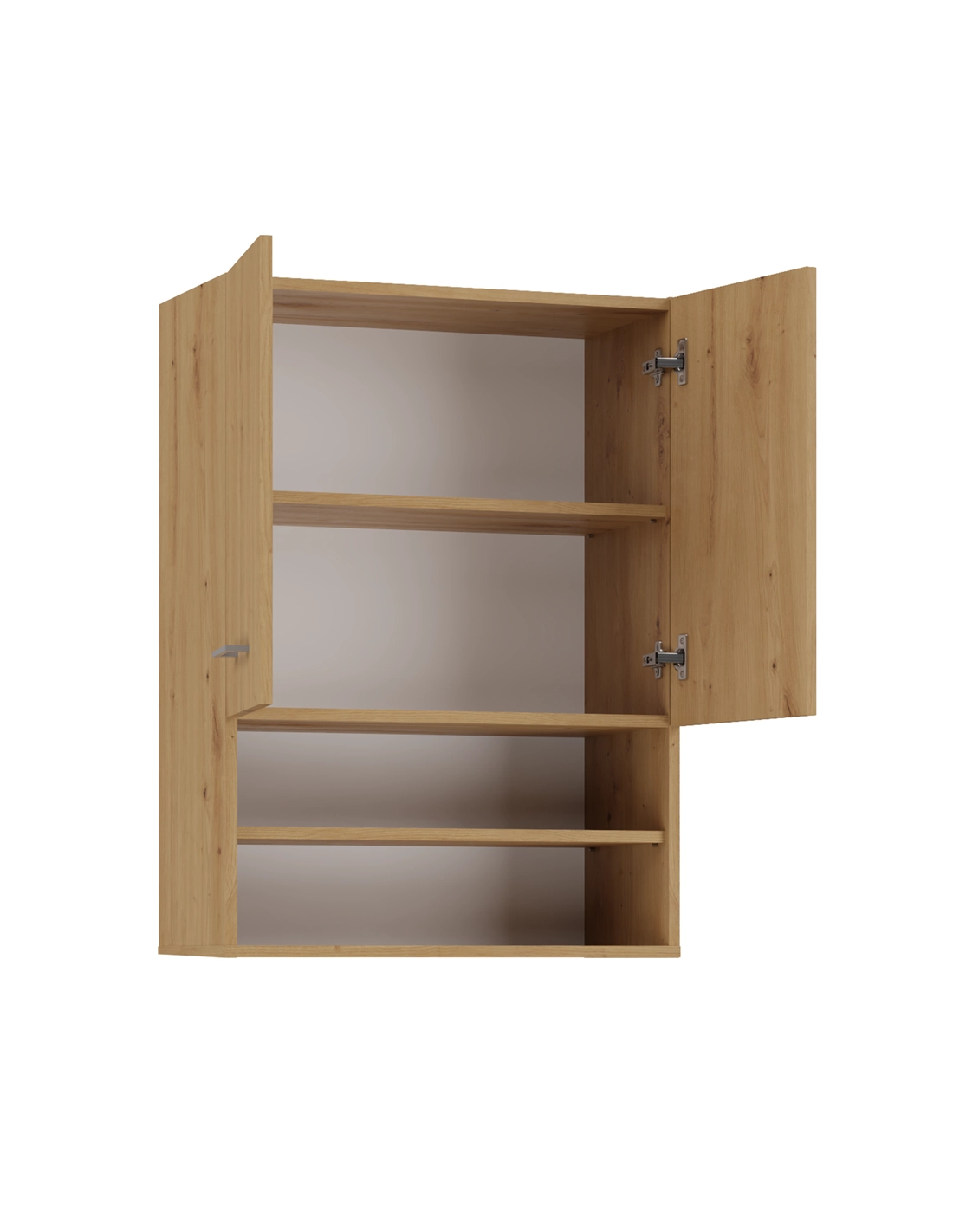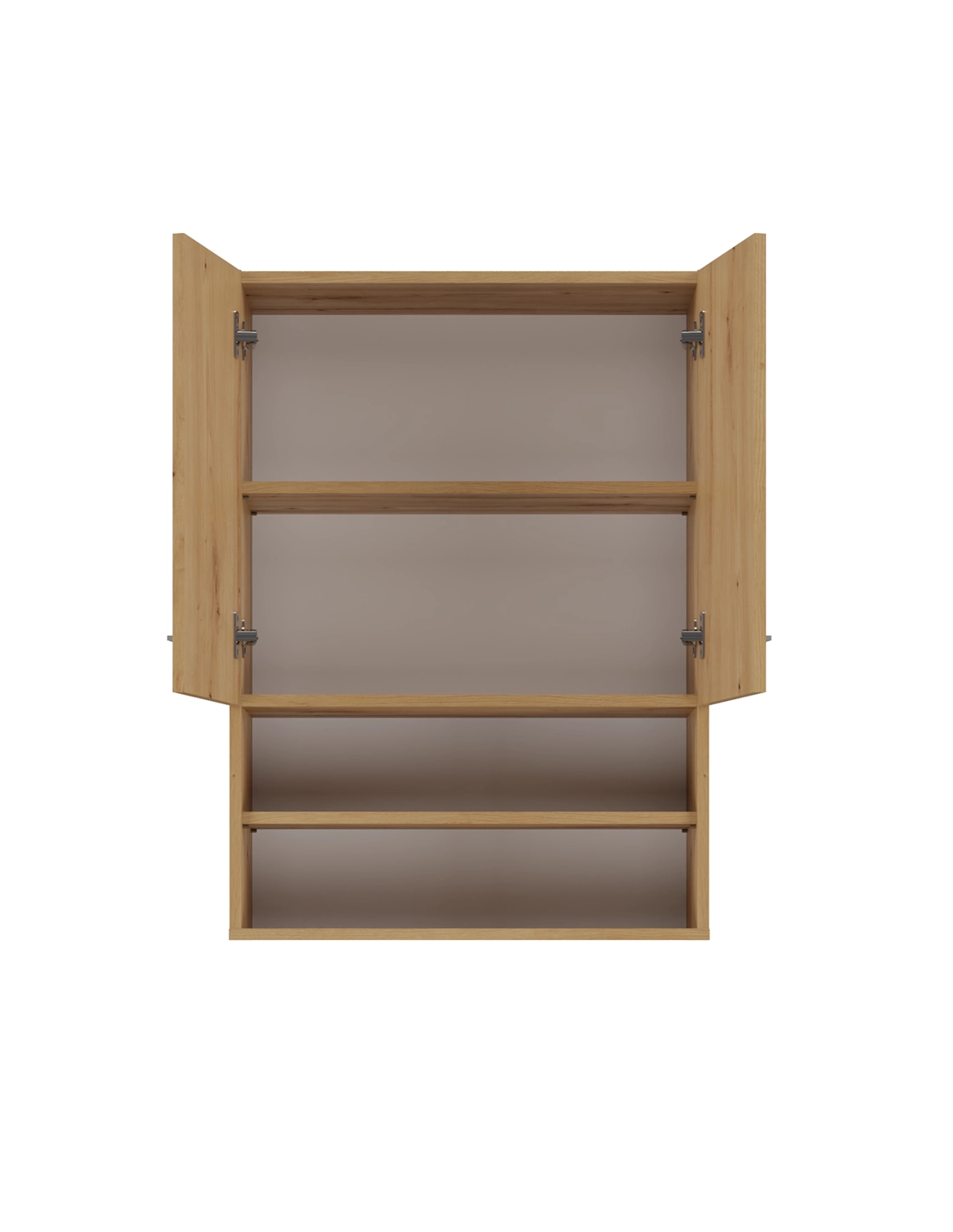 - Praktyczne przechowywanie – szafka posiada dwoje drzwi, za którymi kryją się dwie półki, oraz dwie otwarte półki na widoku