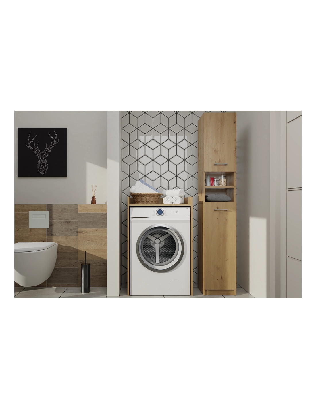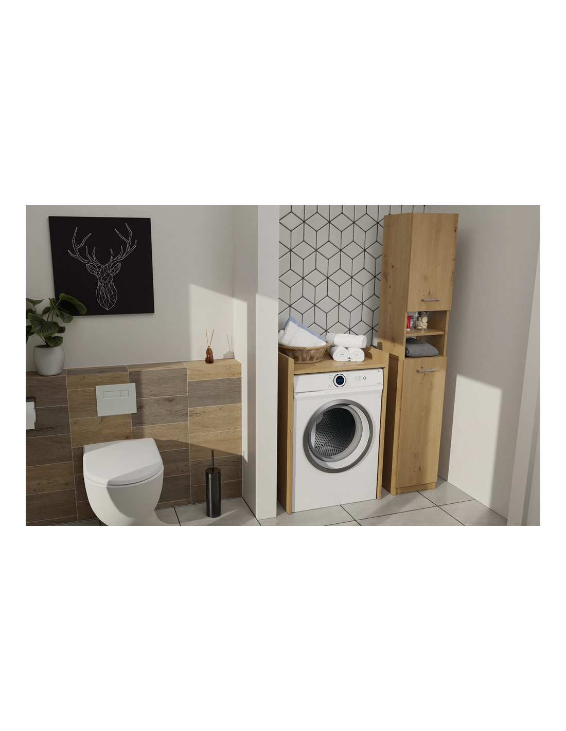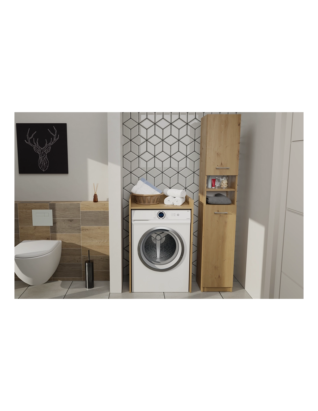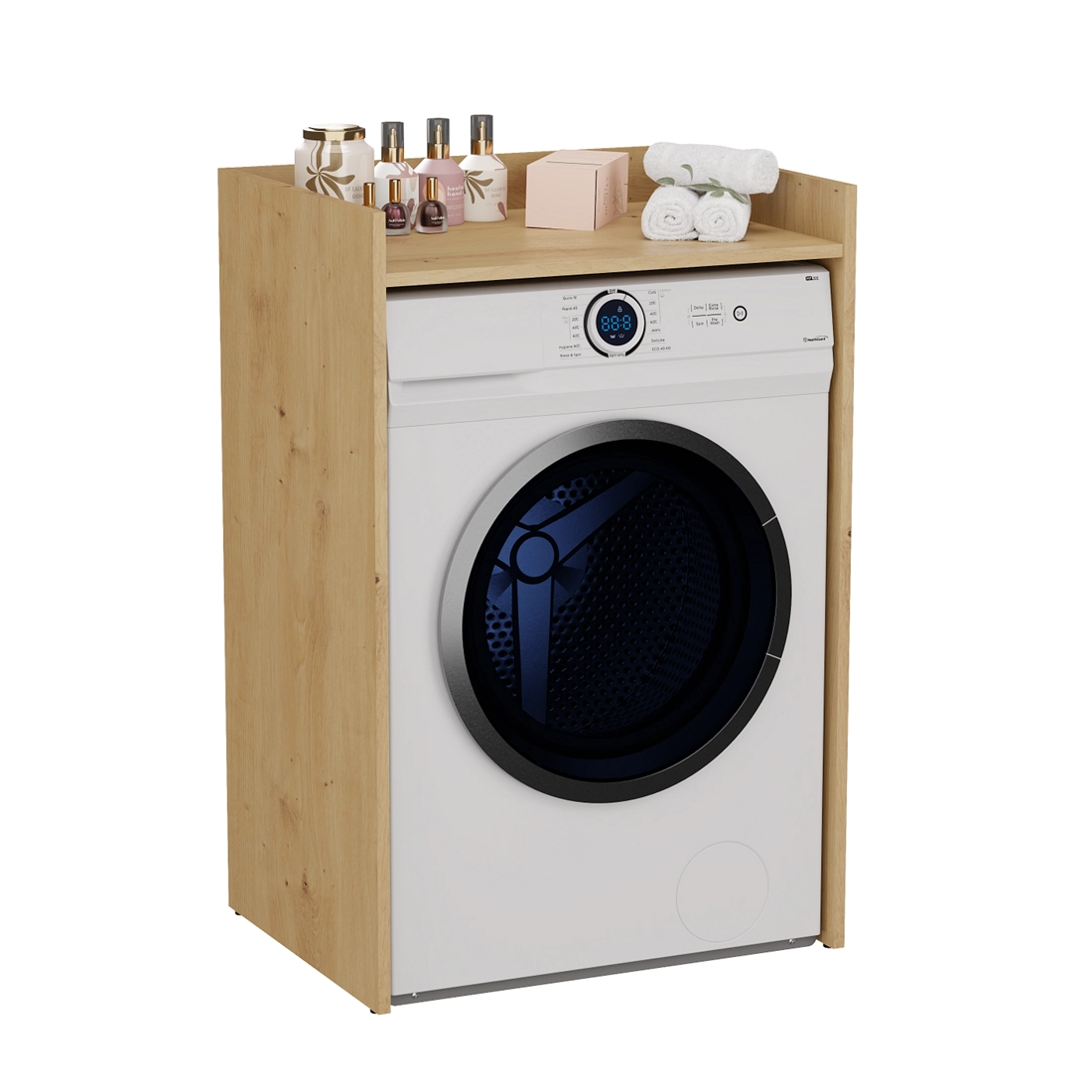 - Zagospodarowanie Przestrzeni: Idealna do wykorzystania miejsca nad pralką, dzięki czemu oszczędzasz przestrzeń w łazience, jednocześnie zyskując dodatkowe miejsce na przechowywanie.