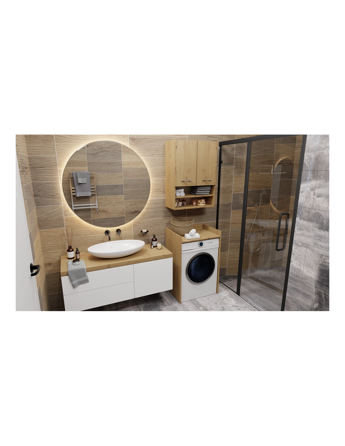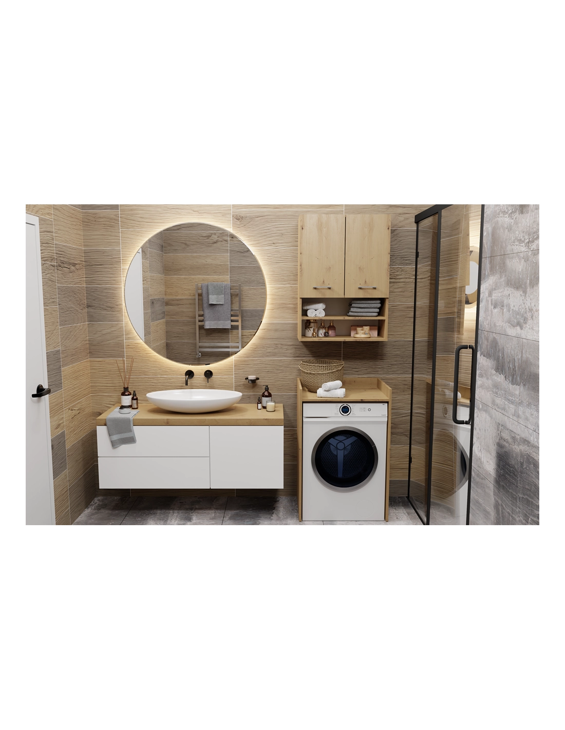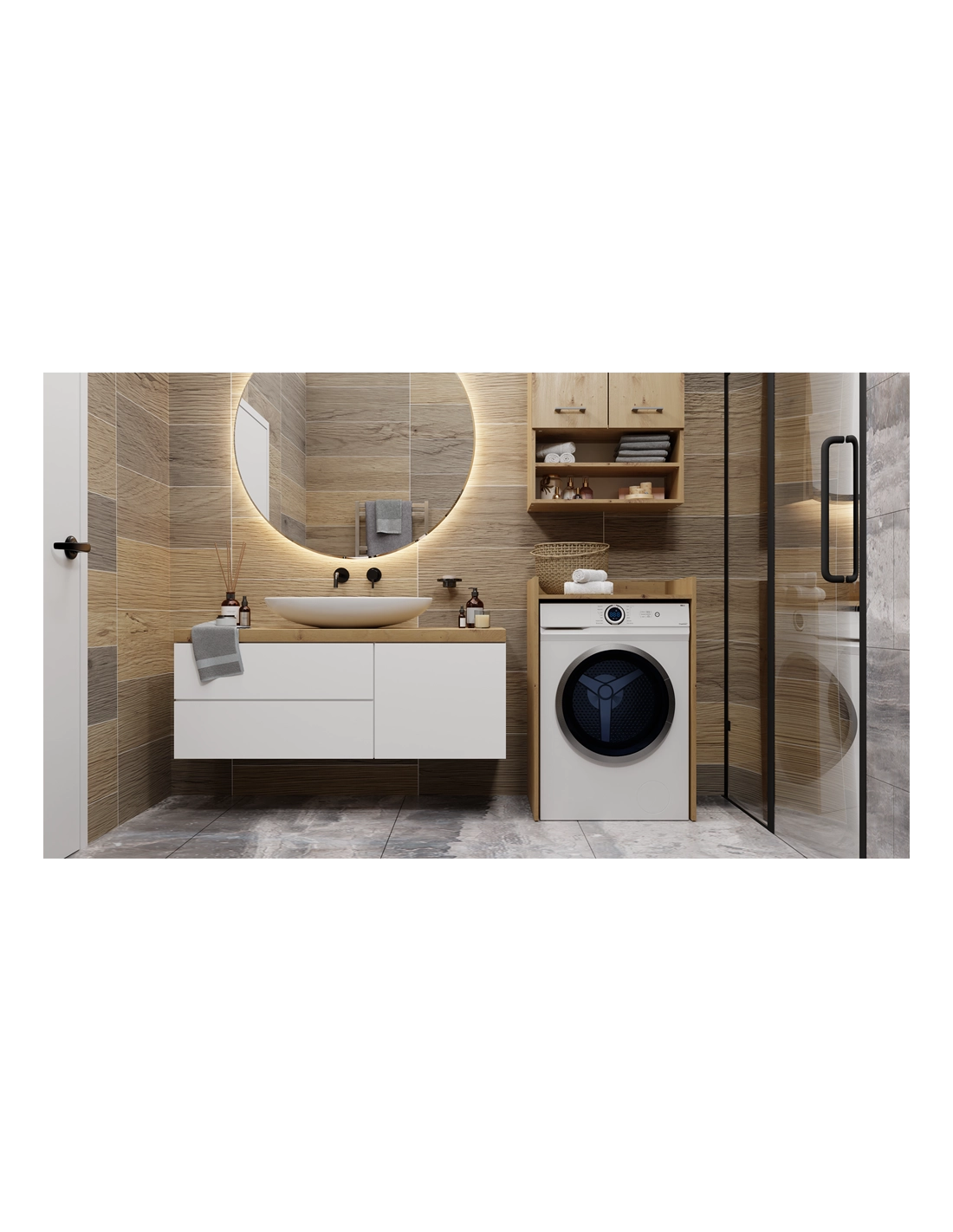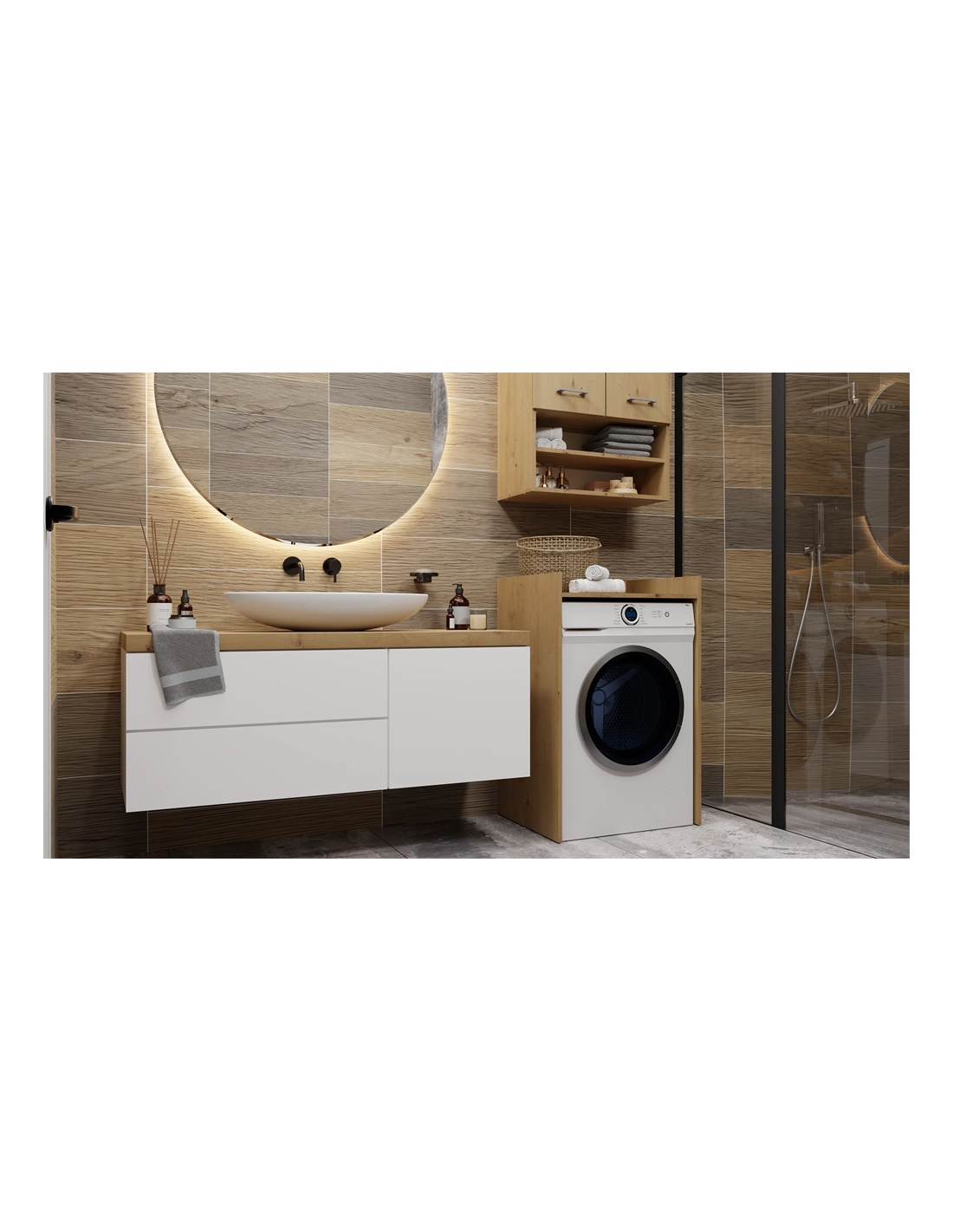 - Zagospodarowanie Przestrzeni: Idealna do wykorzystania miejsca nad pralką, dzięki czemu oszczędzasz przestrzeń w łazience, jednocześnie zyskując dodatkowe miejsce na przechowywanie.