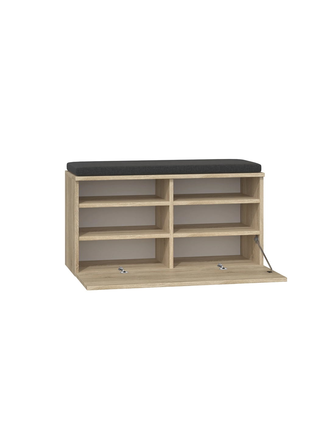 - Schowek na obuwie i akcesoria: Szafka została wyposażona w uchylne drzwi, za którymi znajduje się 6 półek, idealnych do przechowywania butów i innych przedmiotów.